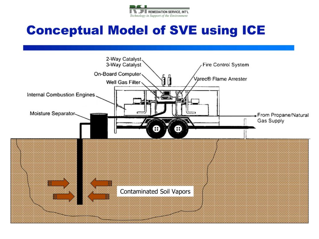 RSI’s internal combustion engine technology offers a low-cost soil vapor extraction strategy for treatment of petroleum hydrocarbons in soil. Combining vapor extraction and contaminant destruction into a single technology, RSI’s ICE offers an efficient approach to traditional engine extraction methods.